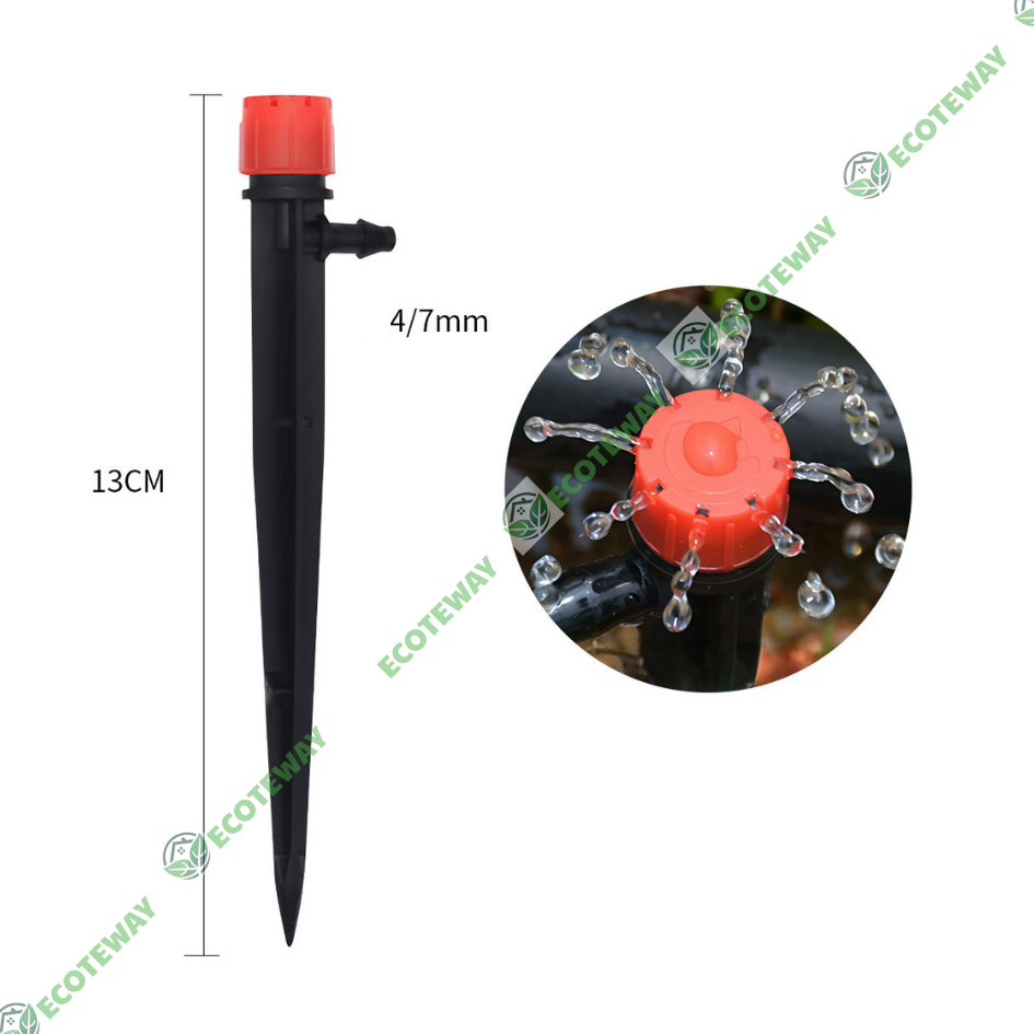 Sản phẩm được thiết kế kèm cọc cắm chắc chắn, dễ dàng cố định trên đất hoặc chậu cây. Đầu béc có thể kết nối nhanh với ống dẫn 4mm hoặc 6mm, phù hợp cho nhiều mô hình tưới từ vườn rau, chậu hoa, cây ăn trái đến nhà kính, sân vườn biệt thự.