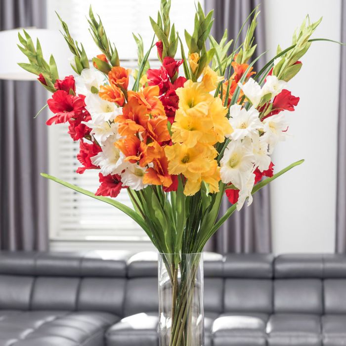 Hoa lay ơn có dáng cao, thân thẳng nên thường được cắm thẳng đứng hoặc hơi nghiêng nhẹ để tôn lên vẻ trang trọng. Với cắm nghệ thuật, có thể kết hợp vài cành nghiêng để tạo sự mềm mại.