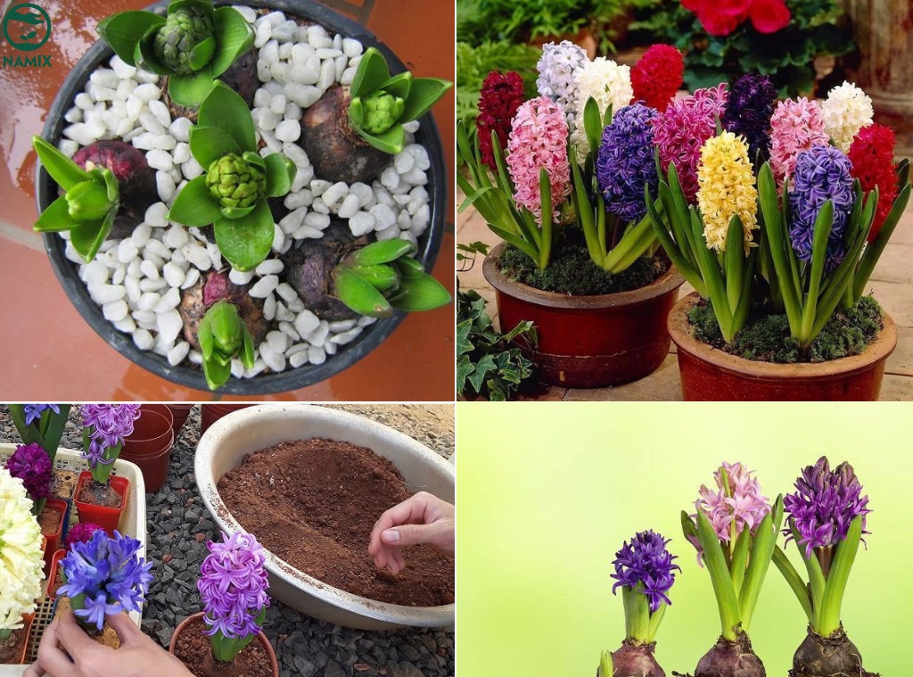 Đầu tiên, cho đất vào chậu sao cho cách miệng chậu 2cm – 3cm. Sau đó, đặt củ vào chậu, các củ cách nhau khoảng 7cm, và để phần chóp củ nổi lên trên mặt đất. Bạn có thể trồng củ sát nhau hơn, nhưng không để các củ chạm vào nhau hoặc chạm vào thành chậu.