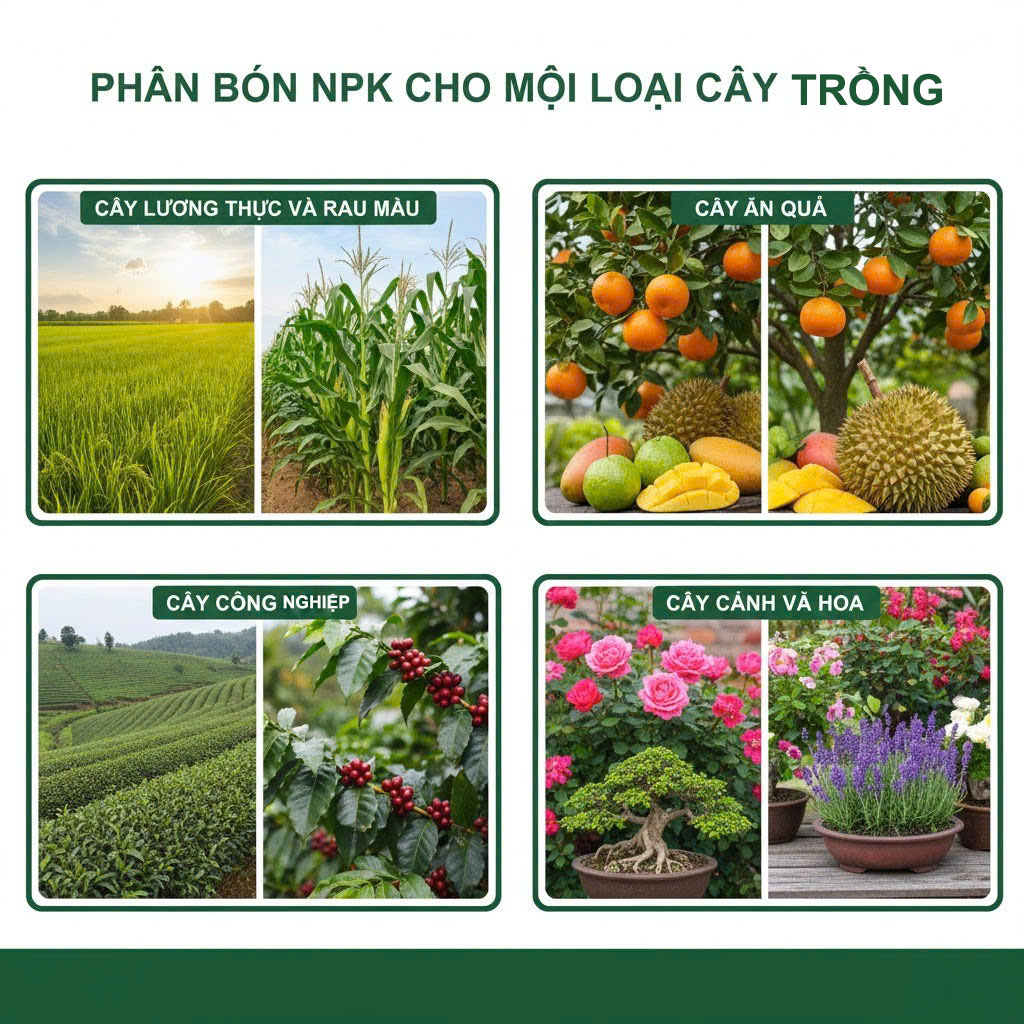 Phân bón NPK phù hợp với hầu hết các loại cây trồng, từ nông nghiệp đến cây cảnh, nhờ khả năng cung cấp dinh dưỡng cân đối.