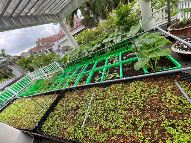 • Không gian xanh mát & sạch đẹp: ban công biến thành “vườn mini trên cao” với hơn 20 khay rau xanh mướt.